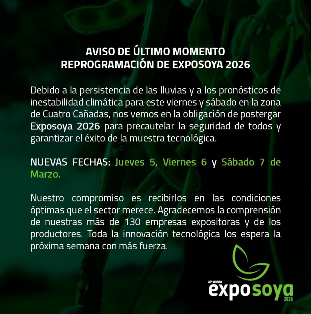 La Asociación de Productores de Oleaginosas y Trigo (Anapo) reprograma la Exposoya 2026 para los días 5,6 y 7 de marzo. Las últimas lluvias caídas en Cuatro Cañadas ocasionaron el cambio de las fechas de realización de la muestra ferial en su 32 Versión.